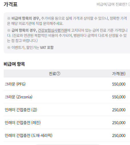 다양한 치과 치료를 제공하며, 가격은 다음과 같습니다. 정확한 비용은 병원에 문의하시면 됩니다.